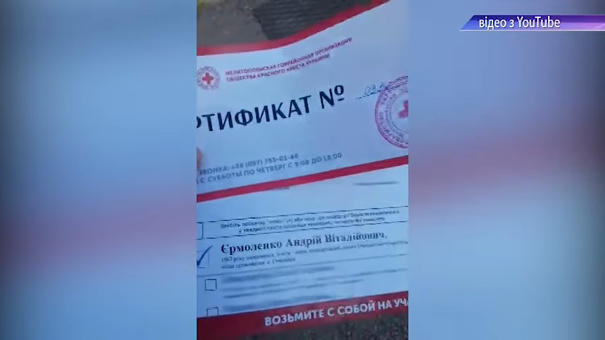 В другом видео показаны сертификаты на получение гуманитарной помощи от Красного Креста, прикрепленные к "агиткам", имитирующим бюллетени, где напротив фамилии одного из кандидатов Андрея Ермоленко, стоит "галочка".