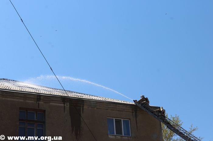 Тем временем спасатели в полном обмундировании разматывали сразу несколько шлангов, подъехали еще автомобили и скорая помощь. Надев защитные маски, первая группа спасателей с пожарным рукавом наперевес проникли в здание, за ними последовала еще одна группа. В это же время на заднем дворе спасатели, забравшись по автолестнице, тушили пожар с крыши.