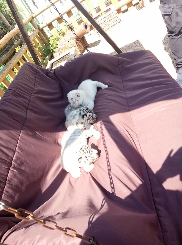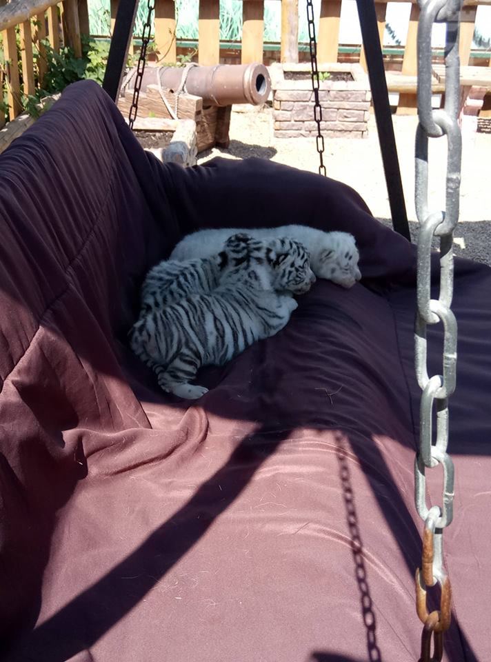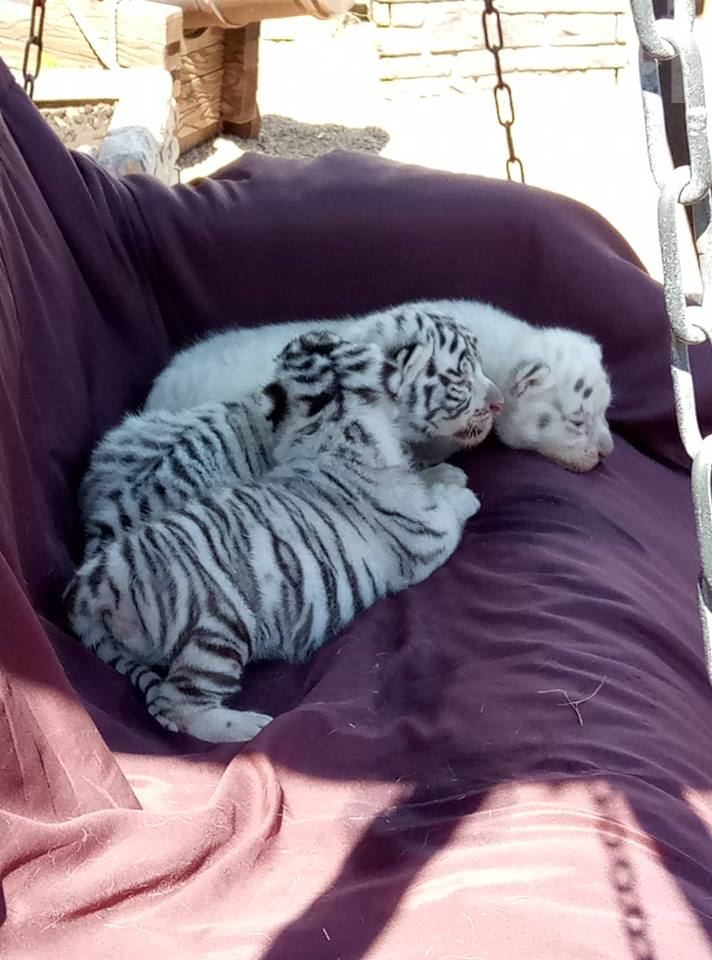 Стоит отметить, ее родители - Франсуа и Азира обычные белые тигры с черными полосками. Два братца маленькой альбиноски тоже обычные белые тигрята. Тройке сегодня исполнилось 22 дня, имен для малышей пока не придумали.
