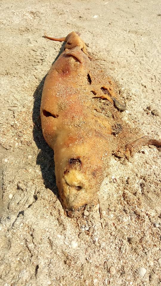 Вероятно, редкий в наших краях морской обитатель попал под винты катера, так как на его теле отчетливо видны рубленные раны от лопастей двигателя.