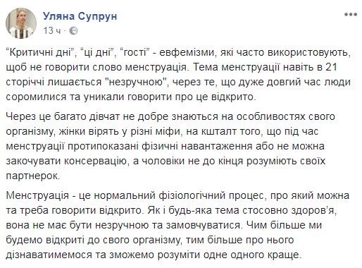 Менструация является нормальным физиологическим процессом, о котором можно говорить открыто. Об этом написала временно исполняющая обязанности министра здравоохранения Ульяна Супрун на своей странице в Facebook.