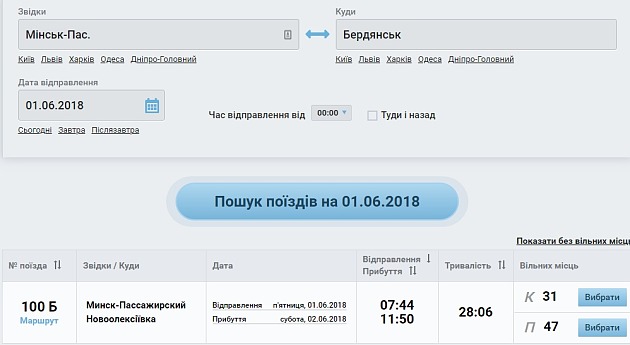 На 1 июня на сайте "Укрзалізниці" уже появились в продаже билеты на поезд №100Б, который будет курсировать по маршруту "Минск - Новоолексеевка" с прицепными вагонами в Бердянск. Стоимость места в купе - чуть больше 2600 грн. А плацкарт - от 1600 с лишним.