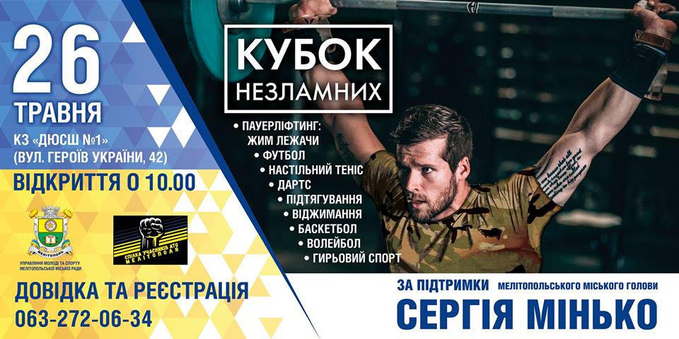 Союз участников АТО Мелитополя и Мелитопольского района совместно с Управлением молодежи и спорта Мелитопольского городского совета организует первые открытые городские соревнования «Кубок несокрушимых». Участники боевых действий будут соревноваться в таких видах спорта, как пауэрлифтинг (жим лежа), футбол, настольный теннис, дартс, подтягивания, отжимания, баскетбол, волейбол, гиревой спорт.