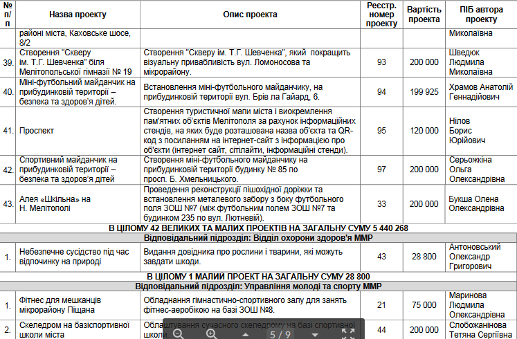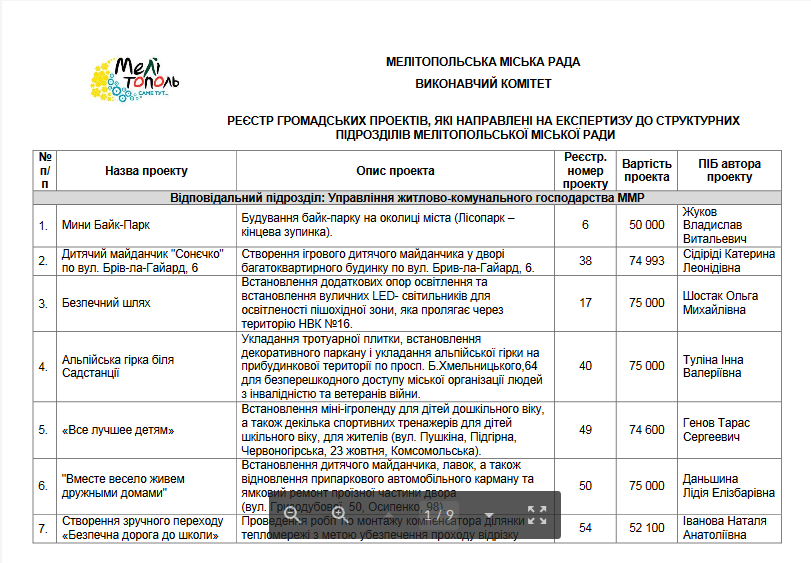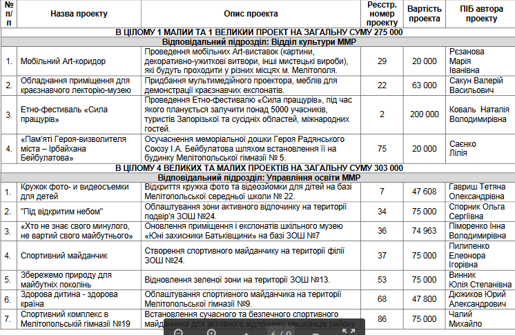 На заседании комиссии по Бюджету участия принято решение отправить на экспертизу в соответствующие структурные подразделения Мелитопольского городского совета 75 проектов на общую сумму 9658394 грн.