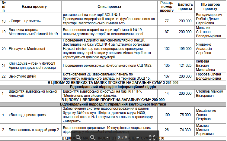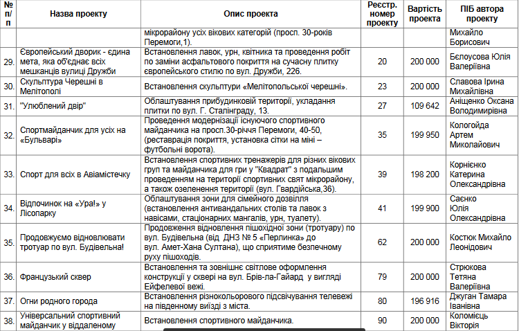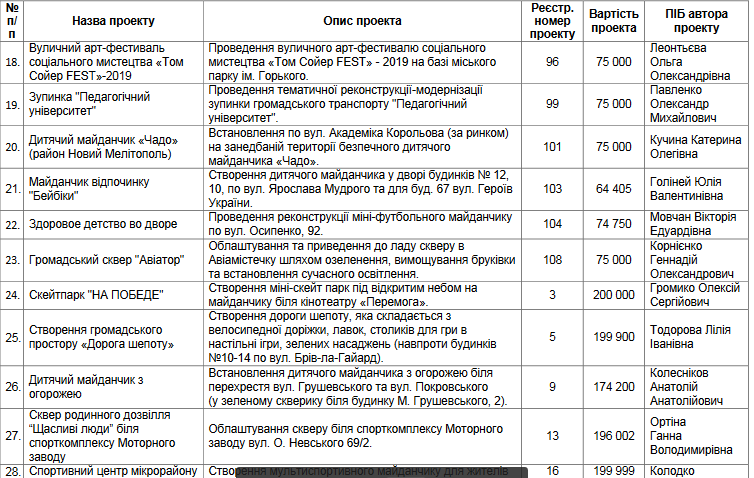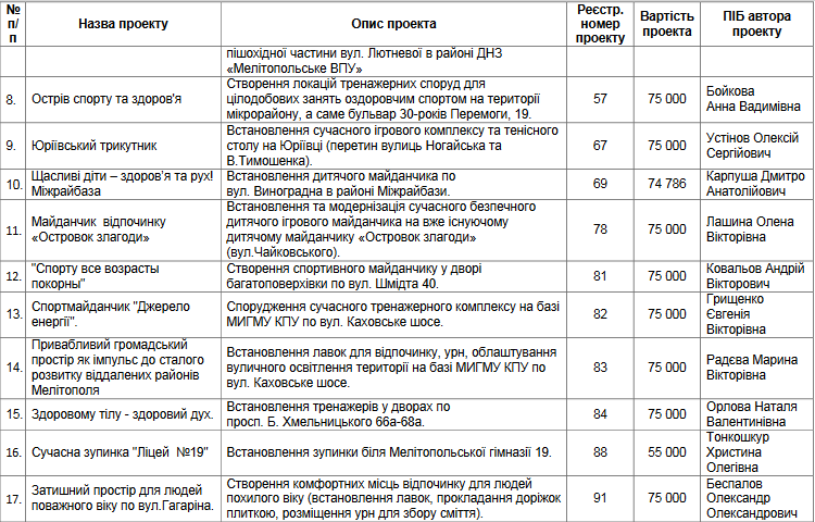 Любой житель города может подать проект, связанный с улучшением жизни, принять участие в конкурсе, победить в голосовании и наблюдать за тем, как его проект реализуют в рамках бюджета. В Мелитополе проект реализуется в третий раз.