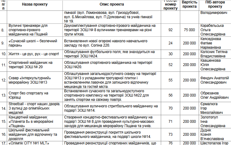 Со списком проектов Бюджета участия, переданных на экспертизу, можно ознакомиться в таблице: