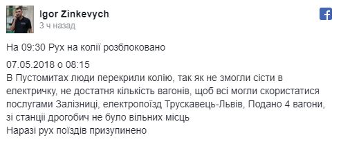"Электропоезд Трускавец - Львов, подано 4 вагона, со станции Дрогобыч не было свободных мест. Сейчас движение поездов приостановлено", - написал Игорь Зинкевич.