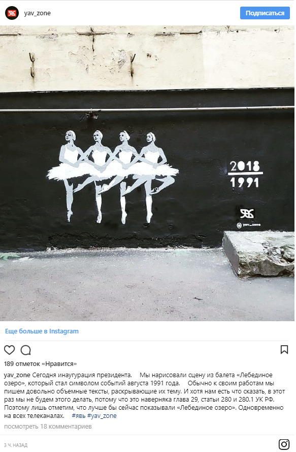 "Сегодня инаугурация президента. Мы нарисовали сцену из балета "Лебединое озеро", который стал символом событий августа 1991 года. Обычно к своим работам мы пишем довольно объемные тексты, раскрывающие их тему. И хотя нам есть что сказать, в этот раз мы не будем этого делать, потому что это наверняка глава 29, статьи 280 и 280.1 УК РФ. Поэтому лишь отметим, что лучше бы сейчас показывали "Лебединое озеро". Одновременно на всех телеканалах", - написали авторы изображения.