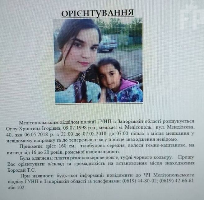 Пропавшая девушка - Оглу Кристина Игоревна проживает в Мелитополе. Как сообщают правоохранители, в промежутке между 21:00 6 мая и 7:00 7 мая она ушла из дому в неизвестном направлении. На данный момент местонахождение Кристины неизвестно.