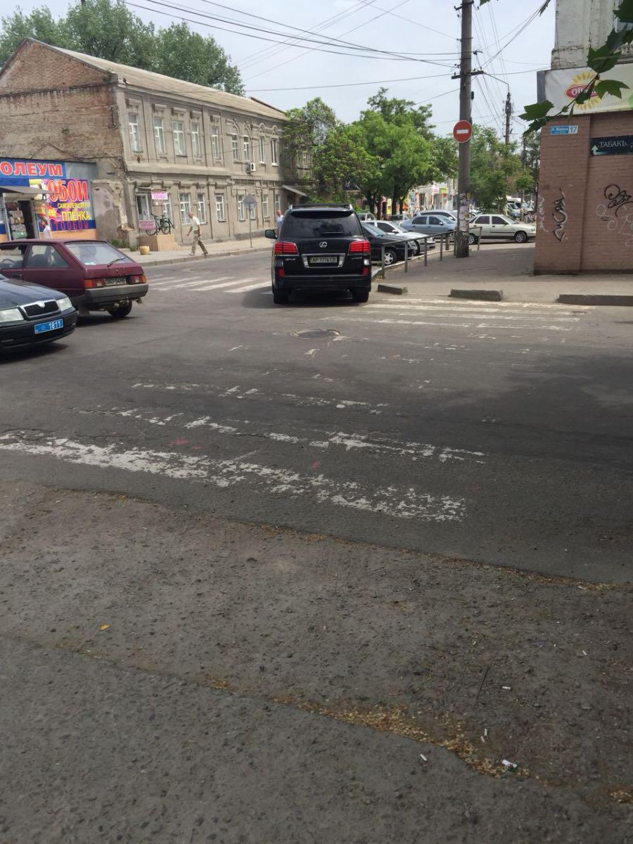 Мало того, что он припарковал свой автомобиль на перекрестке ул. Интеркультурной (бывш. Дзержинского) и М. Грушевского (бывш. К. Маркса), так еще оставил его прямо на разметке пешеходного перехода.