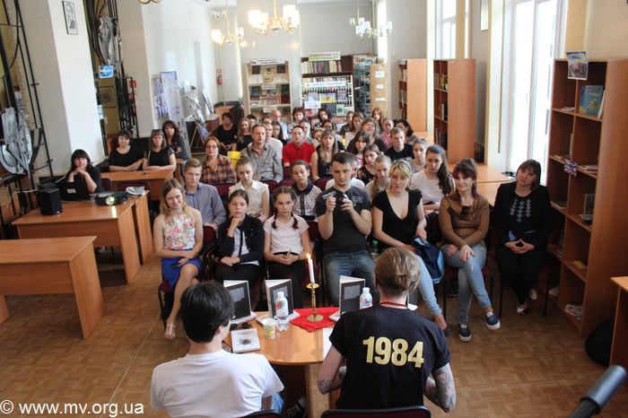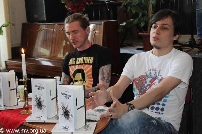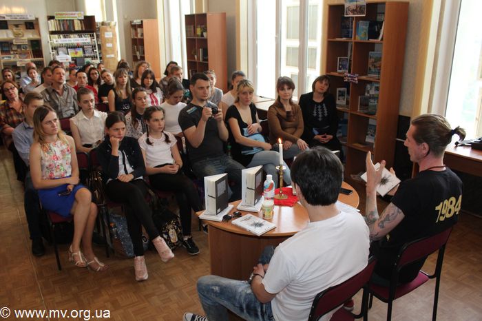 Презентация началась с показа буктрейлера книги, где автором текста выступил Е. Лир, автором видео Энжи Богаченко, звук - Е. Лир и Оскар Шустер. Эта работа завоевала две высшие награды в номинациях "анимационный ролик" и "буктрейлер" на Киевском фестивале анимации. "Якщо в центрі темного підвалу запалити свічку, якщо навколо неї розставити вісім безликих фігур, вісім фігур з порцеляновими головами...", - интригуют первые кадры буктрейлера. И на столике у писателя - восемь книг, горящая свеча, красная ткань - все символично, загадочно. На встречу с Е. Лиром пришло большое количество его читателей, поклонников таланта и просто интересующихся литературой, а особенно "темной литературой" мелитопольцев разных возрастов. Сразу же был предложен формат презентации - не просто диалог, а дискуссия. Евгений рассказывал, рассуждал, а читатели по ходу задавали вопросы, высказывали мнения, вставляли реплики. Разговор получился открытым, свободным, интересным и таким, что хотелось побыстрее взять книгу в руки и углубиться в чтение.