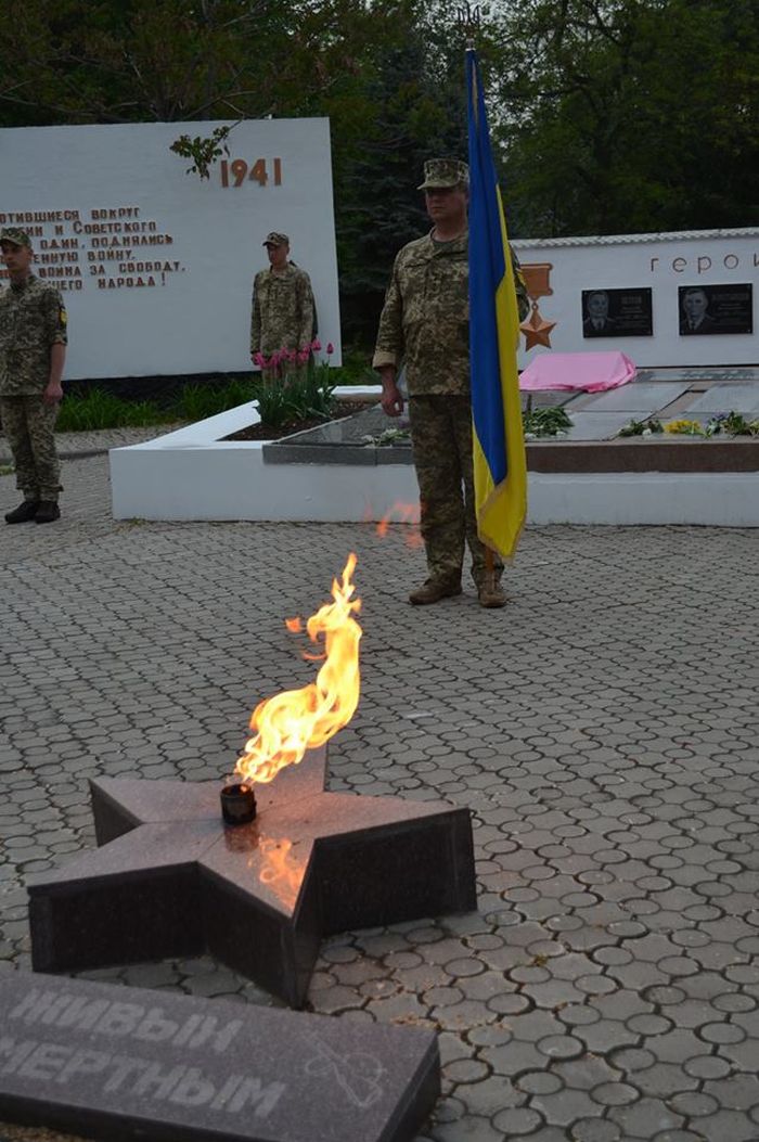 И в первую очередь память тех, кто боролся за мирное небо над головой, почтили торжественным шествием и митингом около мемориала в центральном парке. Во время мероприятия была открыта памятная доска жителю пгт Приазовское, участнику боевых действий Второй мировой войны Василию Литуте. О подвигах мужчины на полях сражений присутствующим рассказал его внук.