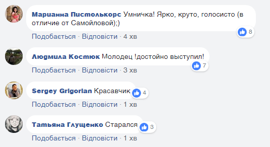 "Это просто невероятно потрясающий перфоменс! Только финал, и только высокое место", "Украина в этом году очень хорошо постаралась", "Ваш украинский Меловин крут", "Смотрю на Костю и вспоминаю его выступление на Х-факторе… Сейчас совершенно другой, но такой же талантливый! 12 баллов из России!", "Если Меловин не пройдет дальше, то я пойду драться", - пишут комментаторы в соцсетях.
