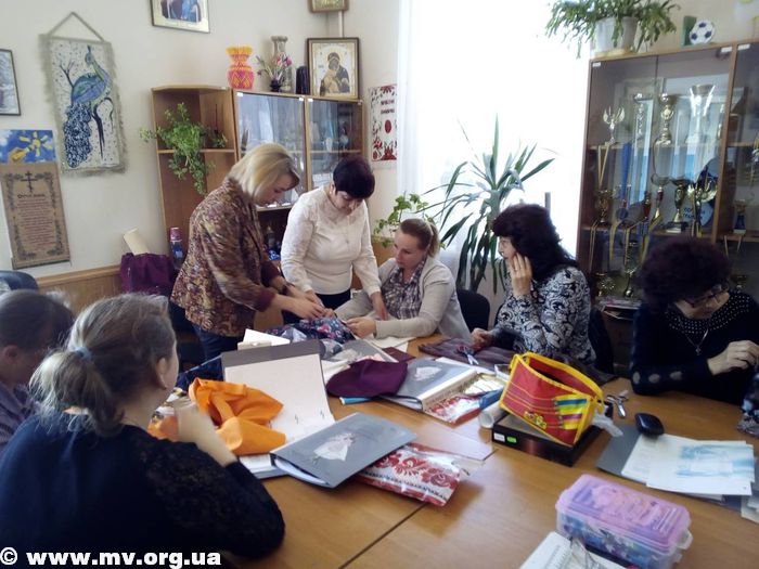 Тренер проекта, мастер производственного обучения «Мелитопольского высшего профессиональное училища» Елена Баричева подходит к каждой из дам и изучает работу. Если есть замечания (а они есть почти у всех), то подсказывает как исправить ошибку, но больше хвалит.