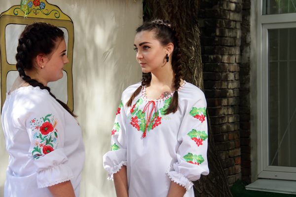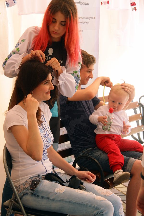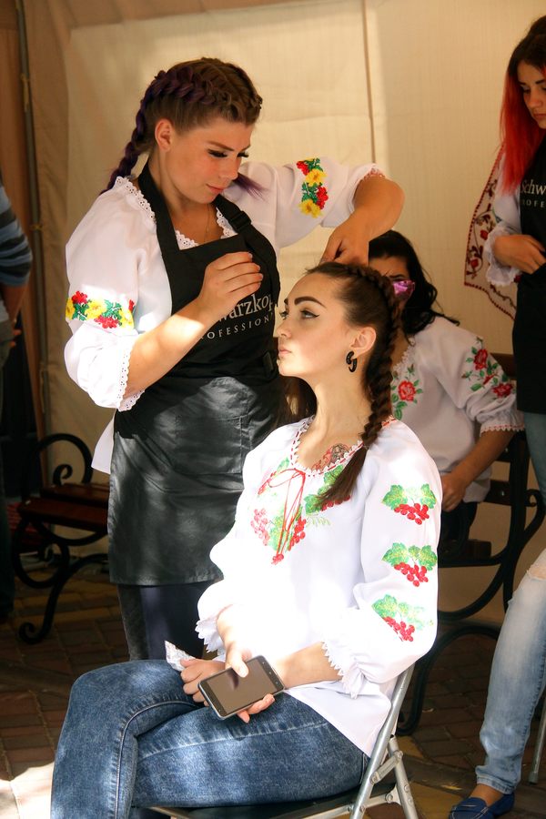 Пока девушки-парикмахеры упражняются в плетении мега-красивых косичек, фотографы "напали" на улыбчивых, симпатичных девчонок в национальных украинских костюмах. Оказалось, что третьекурсницы МВПУ по специальности "Швея-вышивальщица" надели сшитые и вышитые собственноручно юбки и вышиванки, веночки и решили попозировать в качестве фотомоделей. Эти наряды - их курсовые работы, объяснила мастер производственного обучения училища Елена Барычева.
