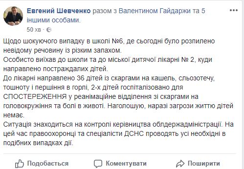 "Относительно шокирующего случая в школе №6, где сегодня распылили неизвестное вещество с резким запахом. Лично выехал в школу и в городскую детскую больницу № 2, куда направлены пострадавшие дети. В больницу направлены 36 детей с жалобами на кашель, слезотечение, тошноту и першение в горле, 2 детей госпитализированы для наблюдения в реанимационное отделение с жалобами на головокружение и боли в животе. Подчеркиваю, пока угрозы жизни детей нет. Ситуация находится на контроле руководства облгосадминистрации. В настоящее время правоохранители и специалисты ГСЧС проводят все необходимые в подобных случаях действия", - написал на своей странице в Фейсбук замглавы Николаевской ОГА Евгений Шевченко.