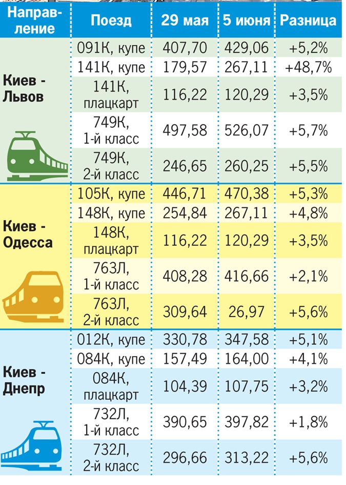 Во-первых, билеты подорожали неравномерно, в среднем на 3-5%, хотя есть и одно выбивающееся из ряда исключение: купейный билет на 141-й поезд до Львова подорожал практически в полтора раза. Поскольку система онлайн-резервирования периодически давала сбои, это даже приняли за ошибку и перепроверили стоимость билетов трижды, однако результат был один и тот же.