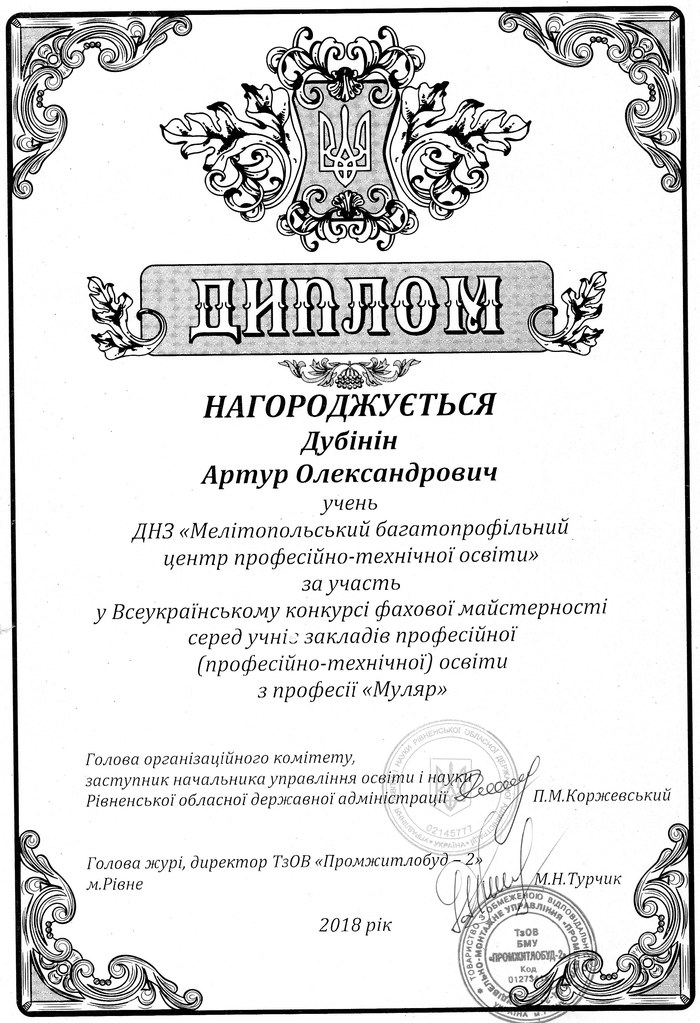 Учащийся 3 курса Мелитопольского многопрофильного центра профтехобразования Артур Дубинин представлял Запорожскую область на Всеукраинском конкурсе профессионального мастерства среди учащихся учреждений системы ПТО по профессии "Каменщик".