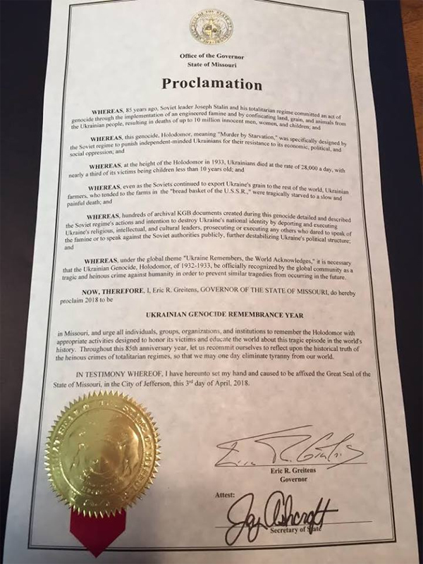 Губернатор штата Миссури Эрик Гретенс выдал прокламацию, в которой признал Голодомор 1932−33 года геноцидом украинского народа. Таким образом Миссури стал 11 штатом США, который принял данное решение, сообщает посольство Украины в США.