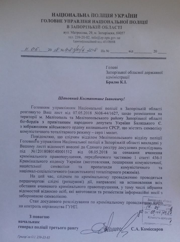 Об этом говорится в ответе начальника областного главка полиции Сергея Комиссарова на запрос губернатора Запорожской области Константина Брыля.