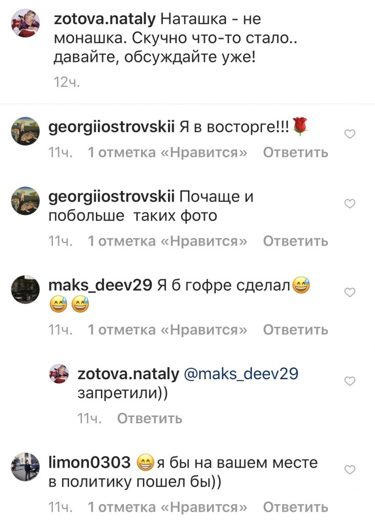 Этот кадр получил одобрение публики, некоторые комментирующие даже высказывали мнение, что Наталье Зотовой необходимо развивать свою карьеру в политическом векторе.