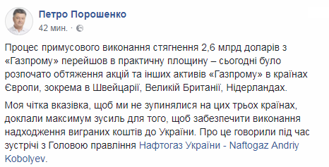 "Нафтогаз Украины" начал процесс принудительного взыскания с российского "Газпрома" долга в 2,6 млрд долларов в зарубежных судах в рамках исполнения решения Стокгольмского арбитражного суда. Информация об этом уже появлялась в СМИ, однако теперь ее подтвердил президент Украины Петр Порошенко на своей странице в Facebook.