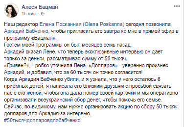 "Аркадий сказал, что теперь эксклюзивные интервью он дает только за деньги, рассматривая сумму от 50 тысяч. "Гривен?", - робко уточнили мы. "Долларов" - уверенно произнес Аркадий, и добавил, что за 60 тысяч он точно согласится! Когда Аркадия Бабченко убили, и я узнала, что у него осталось 6 приемных детей, я написала его близким друзьям с просьбой связать нас с его женой, чтобы она дала номер своей карточки и мы оперативно организовали всеукраинский сбор денег, чтобы помочь его семье.