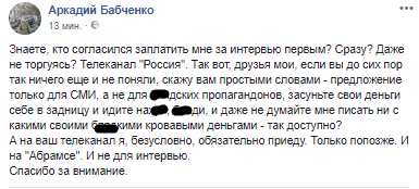 Видимо, чтобы перебить неоднозначное впечатление от своих слов, Бабченко решил написать, что якобы телеканал "Россия" согласился заплатить такие деньги, но он это предложение отверг в грубой форме.