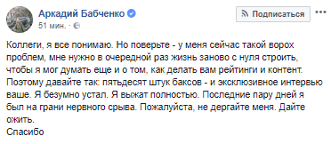 Вскоре после этого, главный редактор интернет-издания "Гордон" Алеся Бацман рассказала о том, как Бабченко отказался давать интервью бесплатно.