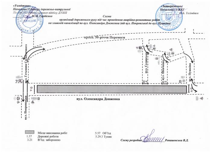 Ремонтные работы на ул. А. Довженко продолжаются. Сегодня часть улицы от ул. Покровской до ул. Пушкина снова будет перекрыта для автомобильного транспорта.