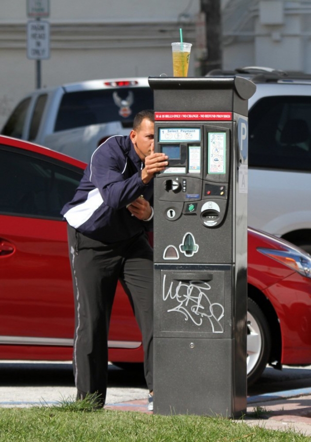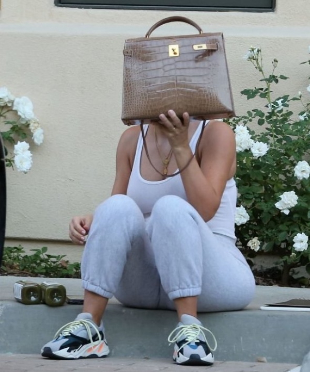 Ким Кардашьян внимательно изучает состав смузи, но, замечая фотографа, прячет лицо за сумкой.