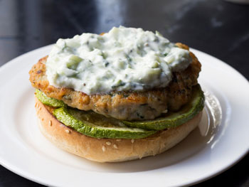 8. Собрать бургеры: нижнюю часть булочки смазать сметанным соусом. Сверху выложить кружочки кабачков. На кабачки выложить котлету. Еще раз смазать соусом и накрыть второй частью булочки. Сразу подавать.