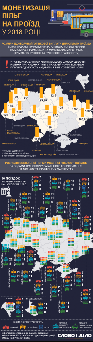 Меньше всего планируют компенсировать льготникам Черкасской и Ивано-Франковской областей – по 60 гривен в месяц. Для жителей этих областей предусмотрено по 11 поездок на троллейбусе и автобусах городского сообщения и по 8 поездок на автобусах пригородного значения.