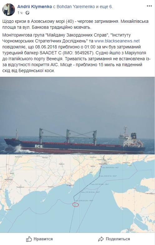"08.06.2018 примерно в 01:00 по мв был задержан турецкий балкер SAADET C (IMO: 9549267). Судно шло из Мариуполя в итальянский порт Венеция. Продолжительность задержания не установлена из-за отсутствия покрытия АИС. Место - примерно 15 миль к юго-востоку от Бердянской косы", - пишет журналист.