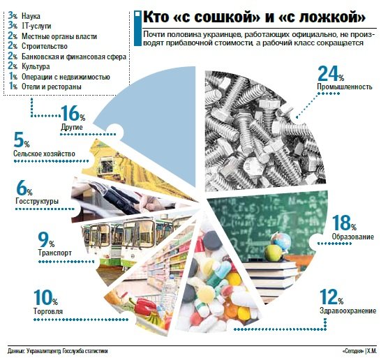 В агросекторе занято всего 5%, хотя, по мнению HR-эксперта rabota.ua Татьяны Пашкиной, реально в сельском хозяйстве работают почти вдвое больше людей, но они не оформлены и статистикой не охвачены. То же касается строительства, где нелегалов до половины, и торговли. Впрочем, даже официально у нас каждый десятый — работник прилавка, прежде всего в крупных и средних торговых сетях, где контроль со стороны государства за соблюдением трудового законодательства жесткий.