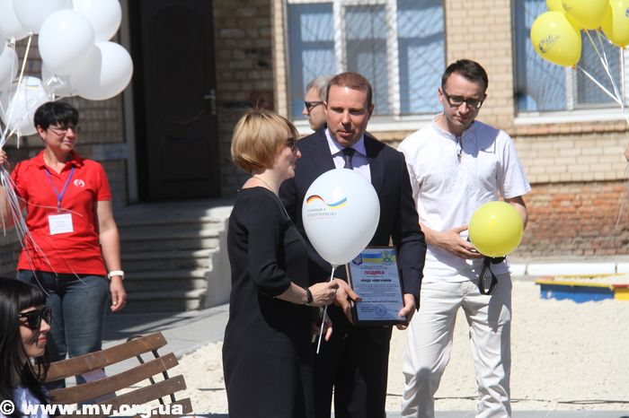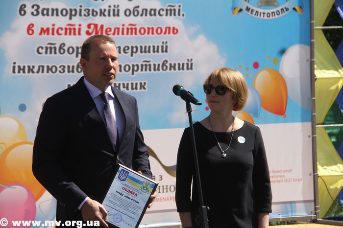 Мэр Мелитополя вручил благодарность от всех мелитопольцев В. Василенко, которая отметила, что сотрудничество с Мелитополем идет в разных направлениях по улучшению услуг, предоставляемых городом населению города, Мелитопольского района и переселенцам из Луганской и Донецкой областей, которые стали частью мелитопольской громады. Это не только социальные услуги, но и медицина, админуслуги, услуги по интеграции, создание пространств для общения, работы. Один из этих проектов - инклюзивно-спортивная площадка - совершенно особенный, отметила В. Василенко. Ведь особенным является и Центр комплексной реабилитации для людей с инвалидностью, таких во всей Украине - единицы. А в Мелитополе такой центр работает, здесь сформировалась под руководством опытного лидера мощная команда профессионалов. Поэтому GIZ решило поддержать именно этот проект.