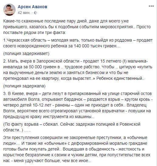 "В Киеве, вчера - дети залезли в припаркованный на улице старючий остов автомобиля "Волга", открыли бардачок - раздался взрыв - кругом кровь - четверо детей 10-12 лет - ранены - один не приходит в себя... Владелец "Волги", вероятнее всего отреагировал установкой взрывчатки-ловушки на предыдущую кражу инструмента из машины", - отметил министр.