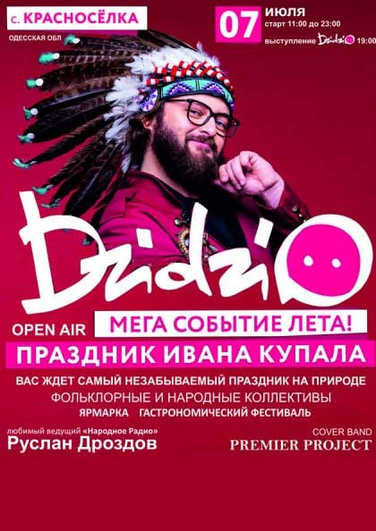 Грандиозный ивент недалеко от Южной Пальмиры впечатляет своими масштабами, оригинальностью. Организаторы стремятся максимально точно воссоздать традиции украинского народа, разукрасить все яркими декорациями. На сцене фестиваля свой талант будут дарить украинские звезды, которые по-новому откроют стили фолк и этно. Задаст ритм празднику известный и любимый всеми DZIDZIO. А также компанию вам создадут Камчик, Берегиня, Premier Project.