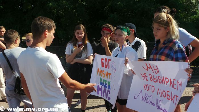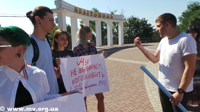 - Сегодня в Киеве проходит мероприятие-протест против избиения полицией тех, кто вышел протестовать против "Марша равенства" в Киеве, похожее мероприятие проводим в Мелитополе, чтобы те, кто не смог поехать в Киев, могли выразить свою позицию, - рассказал соорганизатор мероприятия Анатолий Демьяненко. И сравнивает данный митинг с Майданом. - Если вы помните, в начале войны, когда был Майдан, люди по разным городам также выходили и присоединялись к протестам. Мы хотим, чтобы власть не принимала те антидискриманицонные правки и изменения в учебниках.