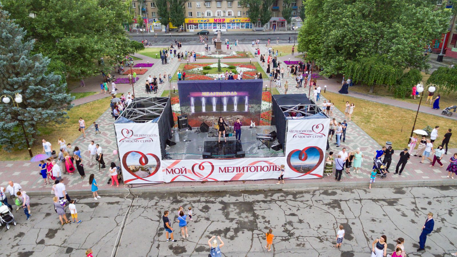 Мелитопольский фотограф Александр Гилькевич с помощью квадрокоптера запечатлел с высоты птичьего полета светский раут выпускников, а также выступление мелитопольских исполнителей.