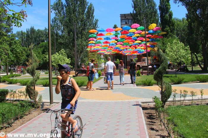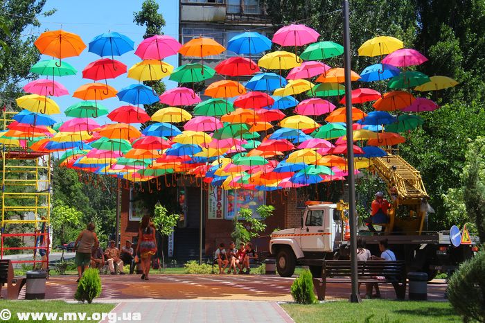 Уже сейчас мелитопольцы могут оценить не только красоту, но и комфорт этой инсталляции. Зонтики развешивают сплошным полотном над центральной площадкой сквера. Это дает большую тень, которая так спасает в летнюю жару.