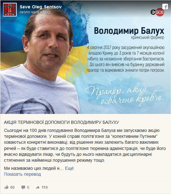 «В каждом деле политзаключенного за "коллективным Путиным“ скрываются конкретные исполнители, от решения которых зависят важные вещи: как будет относиться к политзаключенному тюремная администрация, будет ли его вовремя посещать врач, будут ли налагаться на него дисциплинарные взыскания за малейшие нарушения режима. Мы называем этих людей поименно и обращаемся к ним персонально. Они получают письма от европарламентариев, членов национальных парламентов, должностных лиц Совета Европы и ОБСЕ. Мы это сделаем. Но таких писем должны быть тысячи! Поэтому мы призываем всех, кому небезразлична жизнь Владимира Балуха, присоединиться к акции срочной помощи», — заявляют инициаторы акции, опубликовавшие адреса для отправки корреспонденции в социальных сетях.