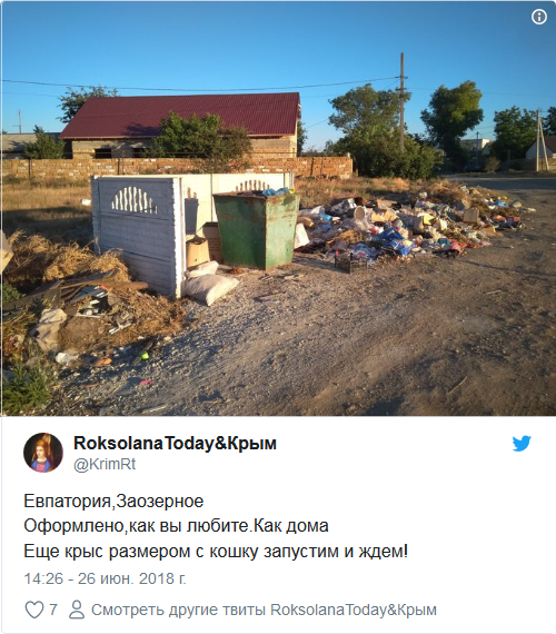 "Евпатория, Заозерное. Оформлено, как вы любите. Как дома. Еще крыс размером с кошку запустим и ждем!" – говорится в сообщении.