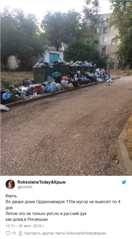 "Керчь. Во дворе дома Орджоникидзе 118 мусор не вывозят по 4 дня. Летом это не только уют, но и русский дух как дома, в Росиюшке", - иронично отмечает автор публикации.