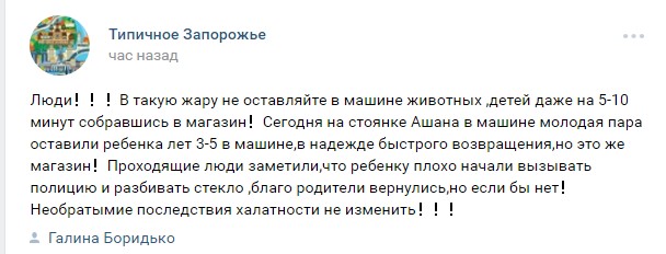 Вчера, 25 июня, в дном из популярных пабликов Запорожья появился пост от местной жительницы о том, что на стоянке возле магазина «Ашан» родители оставили в машине ребенка, которому на вид 3-5 лет, а сами отправились в магазин, видимо, в надежде, что они быстро вернутся. Однако ребенку в машине стало плохо, вероятно из-за жары. Это заметили проходящие мимо люди.