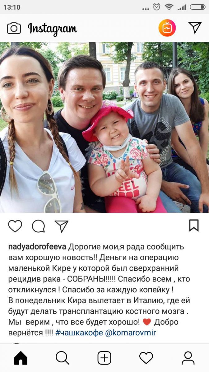 Как ранее сообщалось, украинские звезды Надя Дорофеева и Дмитрий Комаров призывали всех неравнодушных помочь малышке. И вот уже в понедельник Кира может отравиться в Италию на операцию по пересадке косного мозга.