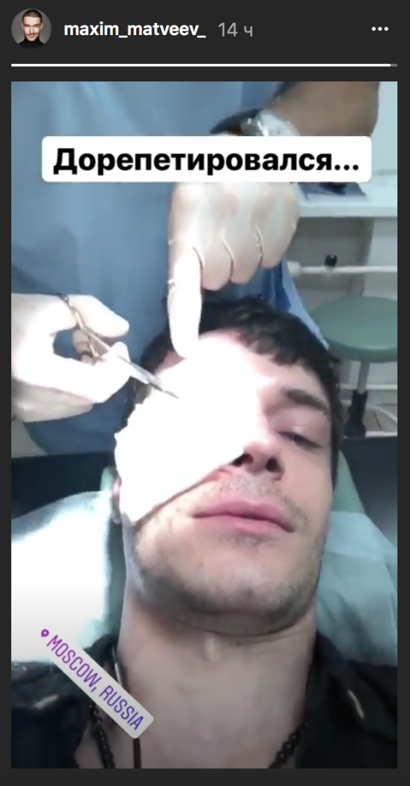 В кадре присутствует не только Матвеев, но еще и двое врачей, которые зашивают актеру рану на лице. Правый глаз Максима прикрыт бинтами и выглядит это кошмарно. Повязка изуродовала лицо артиста.
