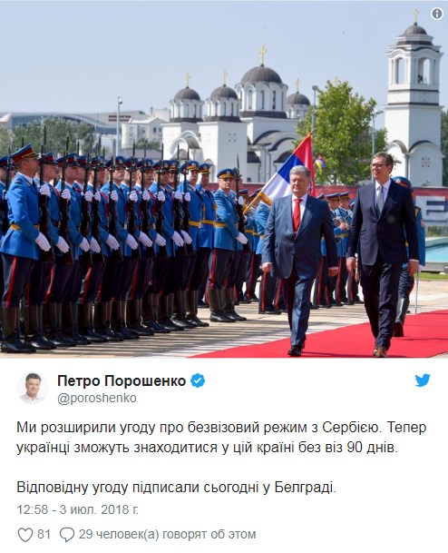 Украина и Сербия увеличили количество дней безвизового пребывания граждан до 90. Соответствующее соглашение подписали 3 июля в Белграде, информирует президент Петр Порошенко, который находится с официальным визитом в этой стране, в Twitter.
