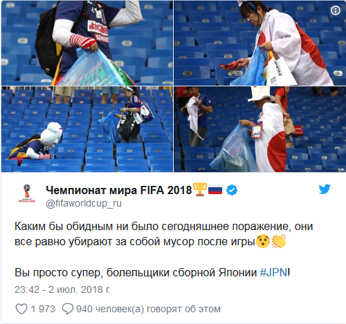 Японские болельщики убрали за собой мусор на стадионе после матчей ЧМ-2018