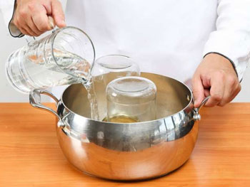 Широкую кастрюлю наполняем водой, сверху ставим решетку, на решетку - банки. Железные крышки от банок опускаем в кипящую в кастрюле воду и кипятим, пока банки находятся под паром.